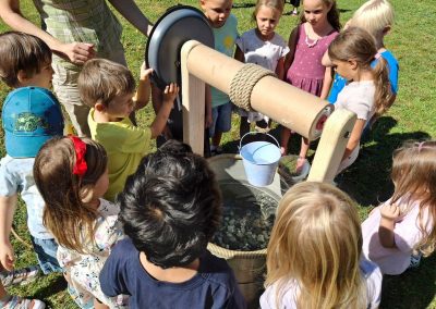 Pitno vodo, ki se nahaja globoko pod zemljo, pridobimo z vrtanjem lukenj v tla, po katerih ta priteče na površje. Otroci spoznajo vodnjak iz katerega sami z vrtenjem vitla, na katerega je z vrvjo pritrjeno vedro, zajamejo vodo. To z majhnimi vedri zlijejo v večji lijak, iz katerega ta po vodovodni cevi priteče do kadi, kjer operejo različno zelenjavo. Otroci vedo, da uporabljena voda ni pitna, z njo z uporabo majhne zalivalke zalijejo rastline v neposredni okolici. Pri igranju si otroci pogosto umažejo svoja oblačila, ki jih starši doma operejo v pralnem stroju. Na delavnici otroci z vedrom zajamejo vodo iz vodnjaka in jo po vodovodni cevi pripeljejo do kadi, v kateri operejo nekaj kosov oblačil. Da je perilo čisto, moramo dodati nekaj kapljic detergenta. Otroci vedo, da je ta voda onesnažena in je več ne moremo uporabiti. Če bi z njo zalili rastline, bi te odmrle. Vodo tako z vedri prenesejo do stranišča, kjer jo zlijemo v WC kotliček. S pritiskom na gumb kotlička voda iz njega steče v WC školjko in naprej po kanalizacijski cevi. Ta ima velike luknje, skozi katere lahko otroci opazujejo, kako se voda pretaka po cevi, in jo pričakajo na njenem koncu. Ker vsakodnevno onesnažimo velike količine vode (uporaba šampona pri tuširanju, uporaba detergenta pri pranju posode, perila, …), jo je treba pred izpustom v reke očistiti v čistilnih napravah. Otroci tako ozavestijo, da vsakodnevno uporabimo velike količine vode, ki jo tudi bolj ali manj onesnažimo in ni več primerna za pitje. Tako krepijo zavedanje, da moramo z vodo varčevati (zapiranje pipe med umivanjem rok, zob, tuširanje namesto kopanja, …) in z njo ravnati zelo skrbno.