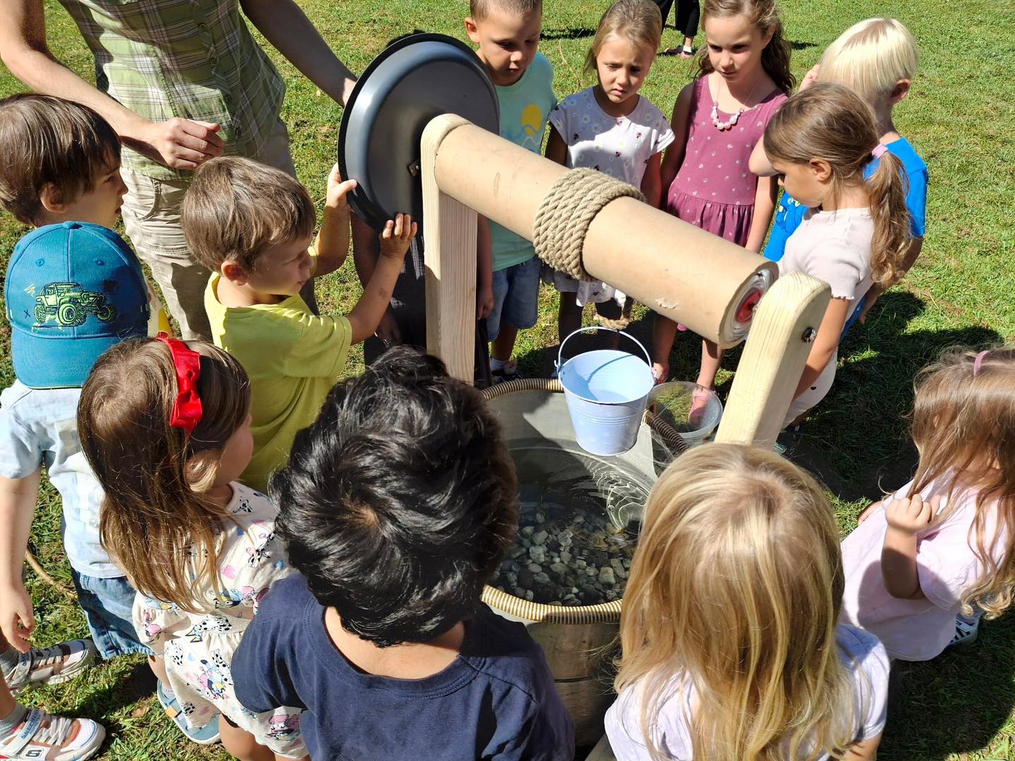 Pitno vodo, ki se nahaja globoko pod zemljo, pridobimo z vrtanjem lukenj v tla, po katerih ta priteče na površje. Otroci spoznajo vodnjak iz katerega sami z vrtenjem vitla, na katerega je z vrvjo pritrjeno vedro, zajamejo vodo. To z majhnimi vedri zlijejo v večji lijak, iz katerega ta po vodovodni cevi priteče do kadi, kjer operejo različno zelenjavo. Otroci vedo, da uporabljena voda ni pitna, z njo z uporabo majhne zalivalke zalijejo rastline v neposredni okolici. Pri igranju si otroci pogosto umažejo svoja oblačila, ki jih starši doma operejo v pralnem stroju. Na delavnici otroci z vedrom zajamejo vodo iz vodnjaka in jo po vodovodni cevi pripeljejo do kadi, v kateri operejo nekaj kosov oblačil. Da je perilo čisto, moramo dodati nekaj kapljic detergenta. Otroci vedo, da je ta voda onesnažena in je več ne moremo uporabiti. Če bi z njo zalili rastline, bi te odmrle. Vodo tako z vedri prenesejo do stranišča, kjer jo zlijemo v WC kotliček. S pritiskom na gumb kotlička voda iz njega steče v WC školjko in naprej po kanalizacijski cevi. Ta ima velike luknje, skozi katere lahko otroci opazujejo, kako se voda pretaka po cevi, in jo pričakajo na njenem koncu. Ker vsakodnevno onesnažimo velike količine vode (uporaba šampona pri tuširanju, uporaba detergenta pri pranju posode, perila, …), jo je treba pred izpustom v reke očistiti v čistilnih napravah. Otroci tako ozavestijo, da vsakodnevno uporabimo velike količine vode, ki jo tudi bolj ali manj onesnažimo in ni več primerna za pitje. Tako krepijo zavedanje, da moramo z vodo varčevati (zapiranje pipe med umivanjem rok, zob, tuširanje namesto kopanja, …) in z njo ravnati zelo skrbno.